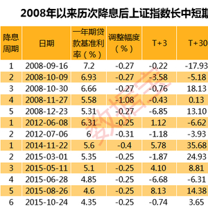 证券时报·数据宝统计,2008年以来,我国共实施过三轮降息周期,期间宣布降息13次,最短间隔时间仅21天。其中,2014年开启的降息潮推动了新一轮牛市行情的到来。