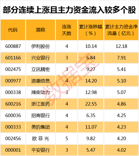值得注意的是,618只连续上涨个股中,39只个股期间主力资金累计净流入超过亿元。其中,累计资金流入最多的为伊利股份,主力资金累计流入12.18亿元。