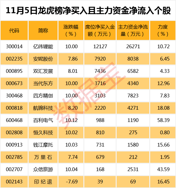 11月5日龙虎榜中机构及营业部席位资金净卖出0.77亿元,其中净买入的个股有18只;净卖出的个股有19只。净买入前三名个股分别是亿纬锂能、安妮股份、双汇发展等,净买入金额占当日成交额比例达4.95%、6.35%、4.89%。