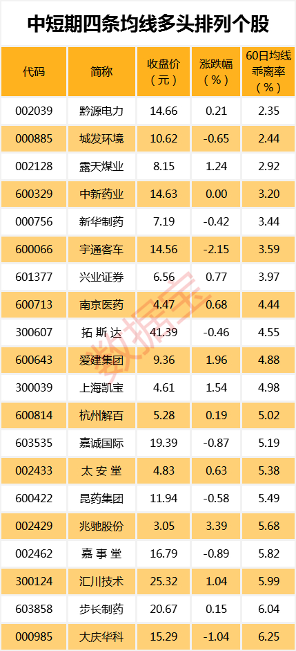 一般来说,均线多头排列代表买方力量强大,后市由多方主导行情概率较大。目前196只个股5日、10日、20日、60日四条均线近日呈多头排列。其中黔源电力、城发环境、露天煤业股价与60日均线的乖离率最小,分别为2.35%、2.44%、2.92%。
