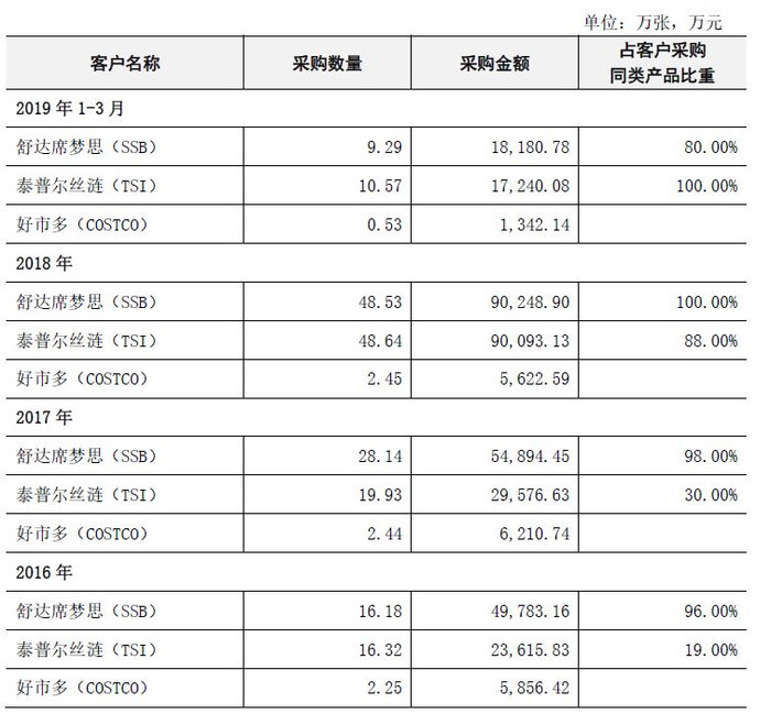 2018年麒盛科技业绩大涨,源于成功拿下第二大客户泰普尔丝涟的巨额订单,后者在麒盛科技采购额不断攀升,从19%一路提升至88%, 甚至2019年Q1全部采购均来自麒盛科技。