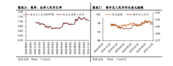 额度方面,深股通上月日均额度使用率达3.01%,额度使用率环比降低0.44%,而沪股通的上月日均额度使用率是1.92%,额度使用率环比降低2.37%。沪市港股通上月日均额度使用率2.35%,环比增加约0.48%;而深市港股通是1.55%,环比增加约0.32%。人民币汇率方面,10月底美元兑人民币是7.0350,较9月底的7. 1381有所升值;而港币兑人民币从9月底时0.9116上升至10月底时0.8982。