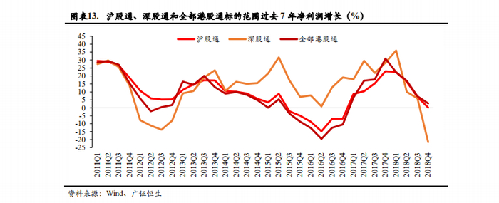 上至10月底,上证、深证和恒指的PE分别是12.76、23.41和9.61倍,上证和恒指的估值在世界主要股市里排名最低,显示估值相对便宜。近12个月股息率方面,恒指仍是最高,是3.51%,而上证股息率为2.35%,而深证是1.33%。18年Q4深股通净利润同比增-21.56%,沪股通是0.15%,而港股通是2.77%。