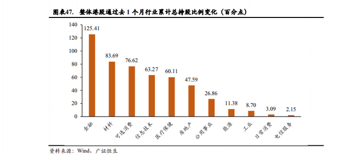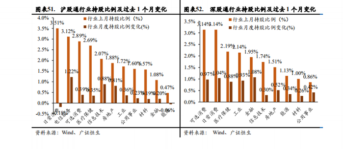 上月沪股通行业持股增幅最多的分别是电信服务、信息技术和房地产,持股比例分别增加1.22%、0.86%和0.81%。深股通方面,行业持股增幅最多的分别是金融、日常消费和可选消费,持股比例分别增加1.08%、1.04%和0.97%。