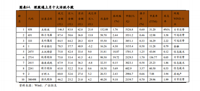 深股通方面,上月累计成交额排名前三行业分别是日常消费、信息技术和可选消费,分别累计成交270.91、239.65和179.01亿元。累计净流入最多的是可选消费和日常消费,累计净流入62.32和23.06亿元。累计净流出最多的行业是信息技术,整月净流出约3.16亿元。