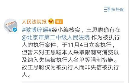 不过,在消息传出后,各家媒体迅速开始了辟谣。例如,人民法院报官微即进行了微博辟谣,称王思聪确有在北京市二中院作为被执行人的执行案件,但暂未对王思聪本身采取限制高消费以及纳入失信被执行人名单等强制措施,故王思聪仅为被执行人而非失信被执行人。