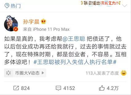 不过,这份道歉现在看起来可算是言不由衷。在王思聪传出被执行人消息的第一时间,孙宇晨再次在微博高调宣称,“如果是真的,考虑帮王思聪把债还了”,并大方表示“过去的事情就过去了,现在是特殊时期,都是创业者不容易”。并在微博里持续与网友互动,“被执行了就是还不上啊”、“1.5个亿就算天使轮投资了”。