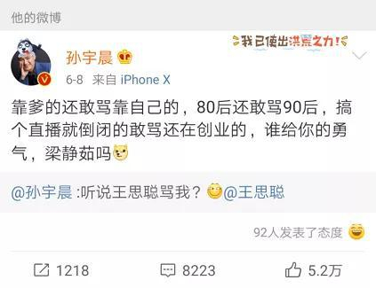期间,孙宇晨曾与王思聪隔空“互怼”。在王思聪在朋友圈转载了一篇名为《孙宇晨与巴菲特的餐桌上,全是“韭菜”》的文章并配以直截了当的评论后,孙宇晨拍案而起,连发数个微博,对王思聪360度开怼。