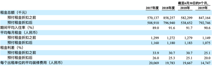招股书显示,2017财年、2018财年及2019年6月30日的前九个月,青客公寓的入住率分别为89%、91.6%和90.6%。 上述期间,青客公寓的平均月租金(打折后)分别为1160元、1180元和1075元;青客公寓获得的折扣后租金差比例分别为26%、25.3%和20%。