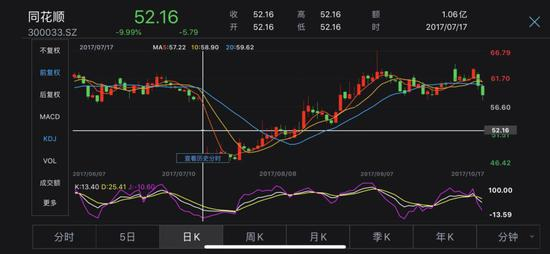 再看一下减持对于短期股价的影响。在同花顺首次披露减持计划的次一交易日,也就是2017年7月17日,公司股价“一”字跌停,第二日再次大跌7.99%。不过,同花顺很快就迎来触底反弹,在接下来的两个月的时间里大涨35%。