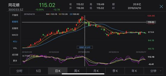 不过,在2019年4月9日晚间同花顺披露新的股东减持计划后,公司股价则在4月10日直接跌停,并带来一波连续的下跌。当然,这与同花顺股价刚刚创出历史新高,而股东便宣布高位减持有很大关系。