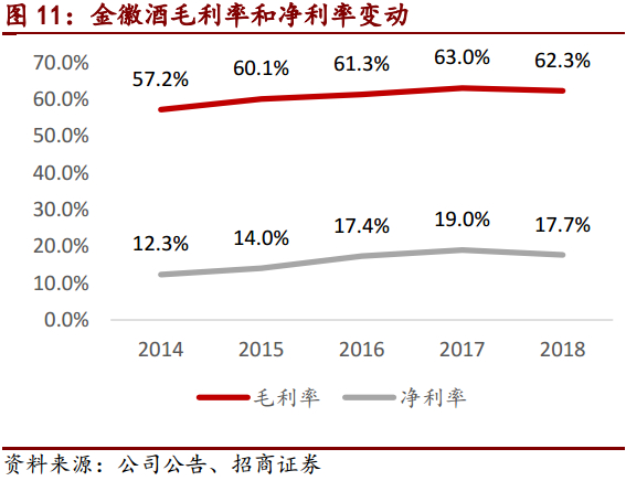 顺应消费升级,高端占比提升,带动盈利能力持续提升。15年白酒行业复苏以来,甘肃省内白酒消费价格带从100元以下持续向100元以上升级,金徽酒高档酒收入占比从2014年24%提升至2018年的36%,高档酒毛利率维持在70%左右,产品结构升级带动公司毛利率和净利率持续提升。2018年公司毛利率略有下降主要系原材料成本上升所致。