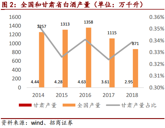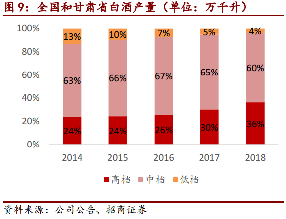 甘肃白酒规模50亿左右,金徽酒市占率达28%,龙头优势明显。从全国范围来看,甘肃省2018年白酒产量2.95万千升,占全国白酒产量0.35%,白酒规模50亿左右。金徽酒起源并聚焦于甘肃省,是当地白酒龙头,市占率达28%。公司产品结构丰富,产品线从高端的金徽系列至低端的陇南春系列,高中低档全覆盖,公司高档产品主要集中在100-500元价格带,避免了与一线名酒茅五泸的直接竞争,主推的中低档产品覆盖率广泛,其营销网络已覆盖甘肃省90%的市县,竞争对手主要是甘肃省内一些区域性品牌,比如滨河、酒泉汉武、古河州、红川等,其中甘肃滨河在河西地区的认可度与知名度较高,是公司主要的省内竞争对手。除金徽酒外,甘肃省还有另一家上市酒企皇台酒业,但是收入和净利润均远远落后于金徽酒。