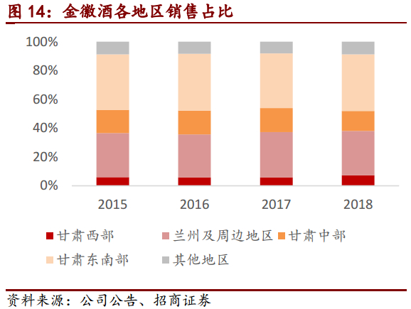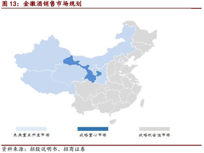 公司立足甘肃大本营,省外稳步布局。金徽酒根据市场拓展及产品销售情况,将销售业务分为省内销售片区和省外销售片区。子公司陇南销售负责陇南市、天水市、定西市、平凉市、庆阳市区域内及甘肃省外的产品销售业务;兰州销售公司负责除陇南销售公司业务范围外的甘肃省内其他地区。公司分别于2013年11月和12月设立西藏实业公司和西安销售公司,积极拓展西藏和陕西区域产品销售业务。关于未来市场规划,公司将省内市场视作战略重心市场,西北市场为未来重点开发市场,西北区域外市场为战略性机会市场。一方面在省内聚焦资源、精准营销,推动渠道扁平化,加强管理、细化考核,促进终端动销;另一方面加快陕西、宁夏、新疆市场建设,新开发内蒙市场。