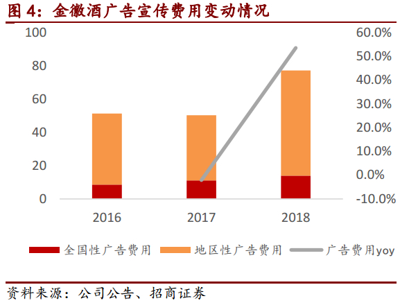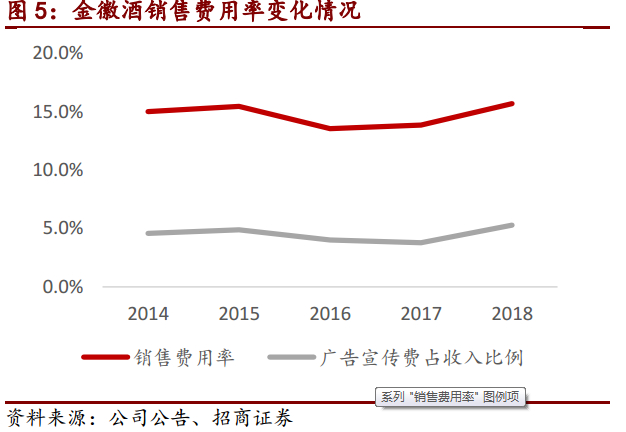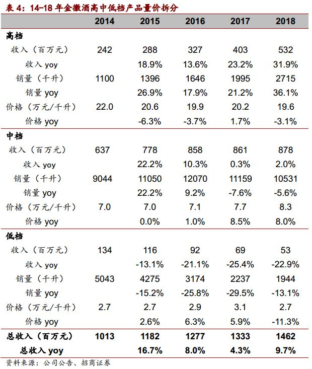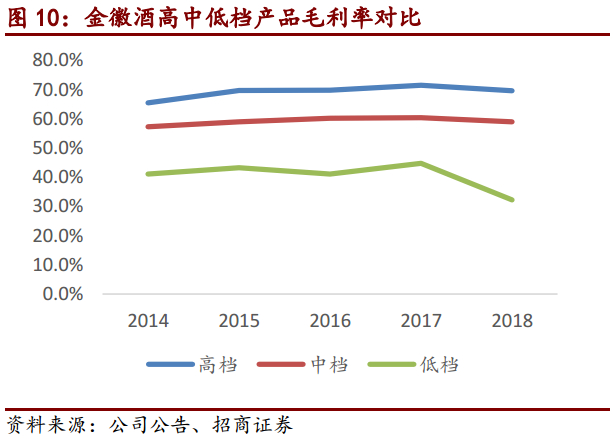 高档快速增长,中档稳增,低档持续收缩。中档酒依然是公司最大的收入来源,2018年收入8.78亿元,其次是高档酒5.32亿元,低档酒仅贡献收入0.53亿元。从增长情况来看,以世纪金徽五星为主的高档酒是增速最快的产品,2018年收入同比增速高达32%,销量同比增速36%。以世纪金徽三星和四星为主的中档酒2017年来保持稳健增长,2018年同比增速2.0%,而低档酒近几年销量下降明显,收入持续萎缩。
