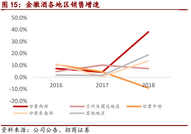 省内消费升级,公司产品升级持续受益。15年白酒行业复苏以来,甘肃省内消费升级趋势明显,从100元以下逐步向100元以上产品升级,公司世纪金徽五星及以上产品保持较高增速,17-18年五星增速超30%,产品结构持续升级。展望未来,随着甘肃人民消费水平的提升,产品价格带有望进一步升级,逐步向东部安徽河南等市场看齐,结构升级将推动公司收入和利润不断提升。