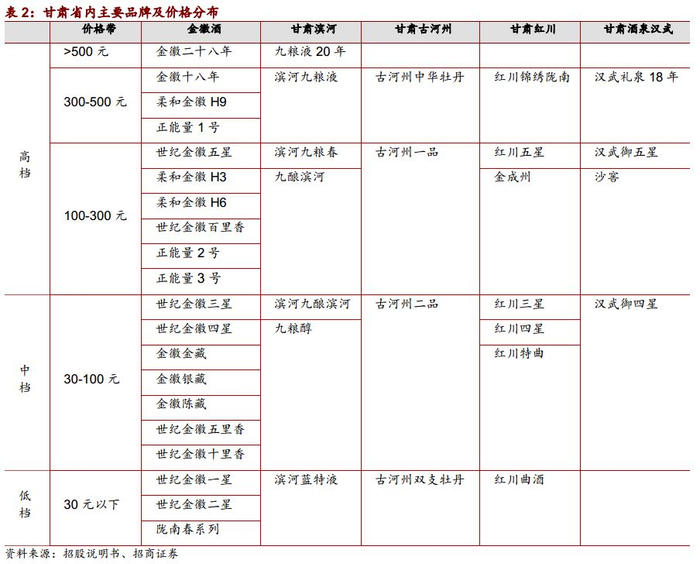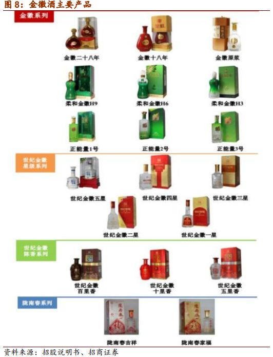 公司产品线覆盖高中低三个档次。公司主导产品有“金徽”、“陇南春”两大品牌,涵盖“金徽年份”、“金徽正能量”、“金徽柔和”等多个系列,价格从30元到500元均有覆盖。公司将产品分为高中低三档,售价100元/500ml以上的定位为高端白酒,30元至100元/500ml 的定位为中端白酒,30元/500ml以下的定位为低端白酒。在公司四大产品系列中,金徽系列主要定位高端;世纪金徽星级系列中五星为高档产品,三星、四星为中档产品,一星、二星为低档产品;世纪金徽陈香系列中百里香为高端产品,五里香与十里香为中档产品;陇南春系列则主打低端产品。