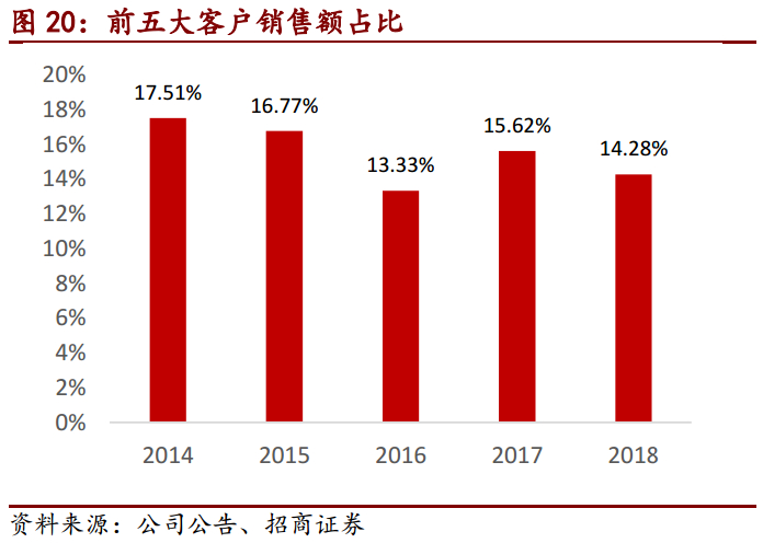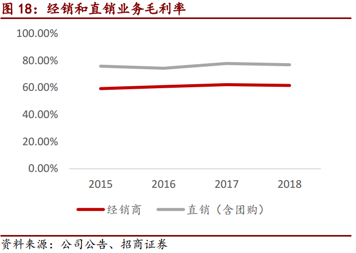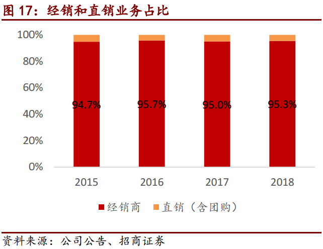 公司销售模式以经销商为主。经销渠道收入占总收入比重超过95%,其余是包含团购的直销模式,由于销售模式的不同,直销业务毛利率维持比经销业务毛利率高15%左右。15-18年,经销商数量呈稳中有升的态势,前五大客户销售占比不断下降。