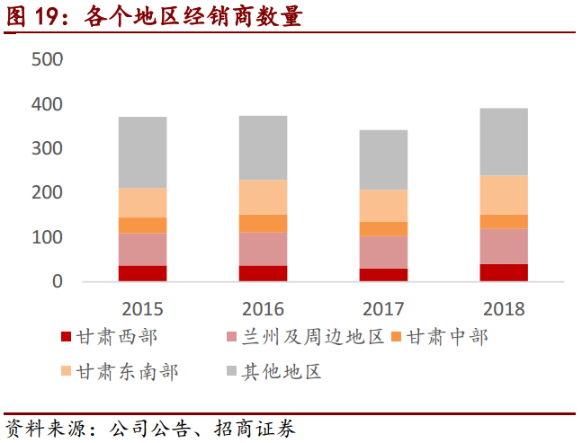 甘肃西部及兰州周边增速较快,甘肃东南部稳增,甘肃中部同比有所下滑。分区域看,省内仍是公司收入的主要来源,19年前三季度省内、省外收入占比分别为85%、15%。省内来看,甘肃东南部及甘肃中部为成熟市场,市占率超过40%,收入增速相对较慢,甘肃东南部19前三季度收入同比+3.2%,甘肃中部则下滑-18%;兰州及周边市占率为1/3左右,19年前三季度收入保持稳增,同比+15.3%;甘肃西部为成长性市场,基数较低,19年前三季度实现55%的高增长,是公司重点发展的潜力市场,当前市占率仍较低,未来有望继续保持较高增速。19前三季度省外同比+66%,表现亮眼,主要是省外加大投入力度所致。19Q3省内/省外经销商分别净增加22/11家至261/163家。