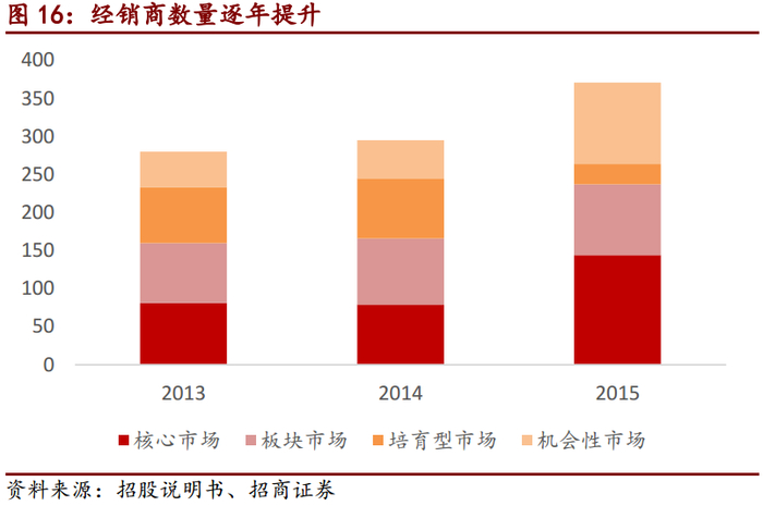 经销商管理体系不断完善,保障经销商渠道利润。公司通过对经销商培训、考核和管理,不断提高经销商经营能力。对于经销商的管理,主要集中在以下几个方面:1)销售目标管理。合同中约定每年销售目标,并将目标层层分解到每个月、每个单品。2)库存管理。业务人员或市场专员每月对经销商库存盘点两次。3)销售价格管理。公司严格管控经销商按照指导价格进行批发、零售,每年对经销商的销售返利、奖励稳定在8%左右。