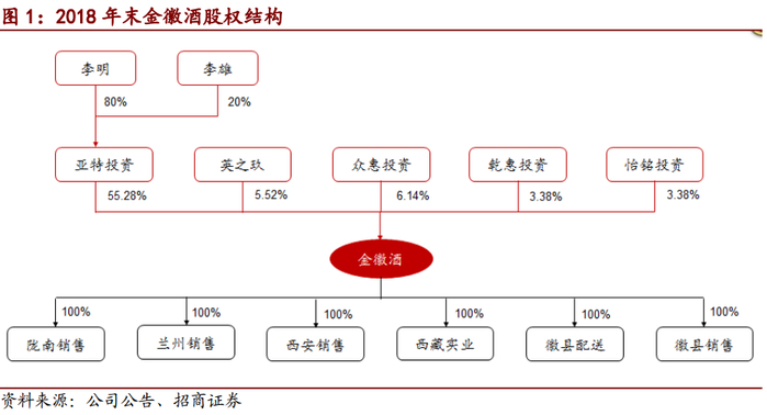 股权集中,核心人员持股保持利益一致。公司控股股东为亚特投资,2018年末持有金徽酒股份55.28%。李明和李雄兄弟二人分别持有亚特投资80%和20%股份,李明为公司实际控制人。除亚特投资外,其余四家投资机构众惠投资、英之玖、乾慧投资和怡铭投资分别持有金徽酒6.14%、5.52%、3.38%和3.38%的股份,根据招股说明书披露,这四家机构的主要股东均是金徽酒的高管团队、生产、销售等部门管理人员以及技术骨干,通过股权绑定的方式保持公司上下齐心。