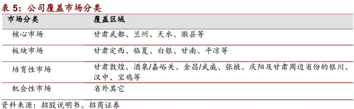 省内占比超90%,贡献主要收入和利润。2018年甘肃收入占比超过90%,省内市场贡献绝大部分收入。省内分区域来看,甘肃东南部及甘肃中部为成熟市场,市占率超过40%,收入增速有所放缓,;兰州及周边市占率为1/3左右,收入保持稳健增长;甘肃西部为成长性市场,基数较低,增速最快,是公司未来重点发展的潜力市场,当前市占率仍较低,未来有望继续保持较高增速。