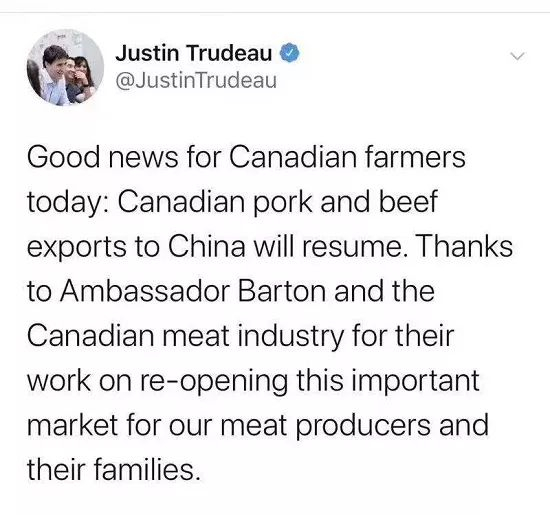 在中国因发现伪造的猪肉检疫文件而于6月25日暂停了所有加拿大肉类进口后,加拿大总理贾斯汀·特鲁多周二发表推文称,“今天有个好消息给加拿大农民:加拿大对中国的猪肉和牛肉出口将恢复。感谢巴顿大使和加拿大肉类行业为我们的肉类生产者及其家人重新打开这个重要市场所做的努力。”