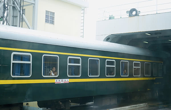 火车抵达港口,车厢被拆卸装载入船。过海后,车厢重组,继续行驶。