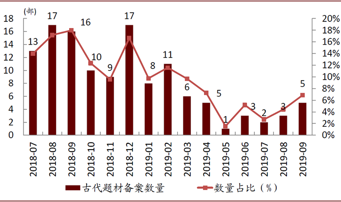 图表: 2018年7月以来古装剧备案公示数量及占比