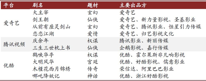 从题材结构来看,监管调控效果明显,古装剧新项目数量骤减。由于监管对古装题材的严厉打压,制作方纷纷调整项目方向,2019年以来古装剧发行和备案数量均大幅减少。我们认为,古装剧立项数量下降有利于该题材内容的去芜存菁,同时也有助于市场供需格局的改善。