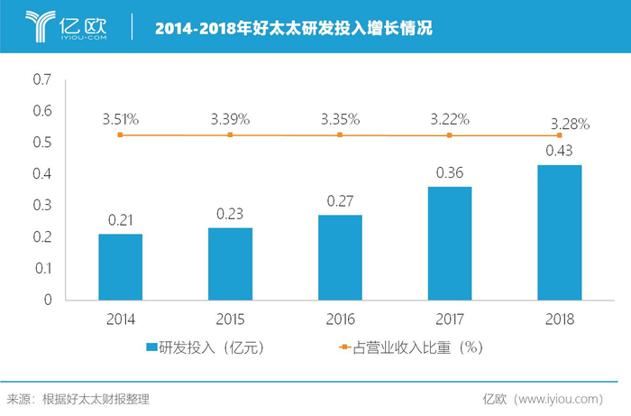 2018年,好太太研发中心更名为“智能研究院”,以“用户”、“体验”、“创新”、“智能”为着力点开展工作,以求创造行业前瞻性产品。该智能研究院下设二级部门“智能物联部”,承担智能硬件赋值及大数据价值创新两大职能,持续跟踪物联网与人工智能领域的前沿技术,并将其融入产品,构建智能家居控制平台,以此来提高公司在智能家居领域的布局与发展。与此同时,好太太在研发上的投入也在逐年增长。