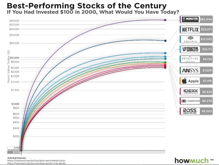 如果你有幸在2000年花100美元买了奈飞(Netflix)股票,那么今天这些股票的价值将暴涨230倍!这样的回报听起来已经很刺激了,对不对?别急,这还不是最好的。