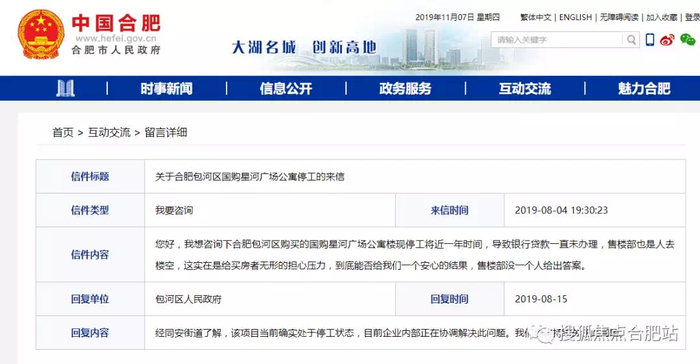 8月15日,包河区人民政府回复网友问答时表示,包河区国购星河广场当前确实处于停工状态,目前企业内部正在协调解决此问题。