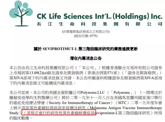 11月6日,李嘉诚家族旗下长江生命科技发布公告称,附属公司研发的“黑色素瘤抗原疫苗“取得重要进展。
