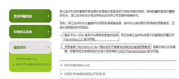 根据公司官网显示,长江生命科技目前正在研究的是黑色素瘤疫苗和舒缓疼痛的河豚毒素。