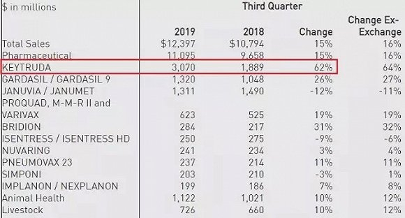 根据默沙东2019年Q3业绩报告,前三季度全球销售收入349.72亿美元,其中Q3销售收入为124亿美元,同比增长15%。