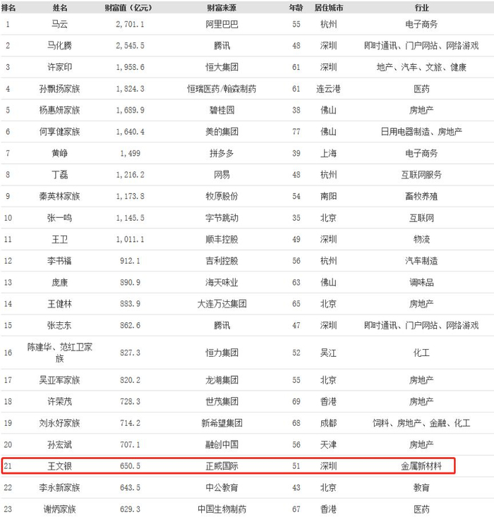 在福布斯日前公布的2019中国400富豪榜中,王文银以650.5亿元的财富值位列第21位,排名紧跟融创中国孙宏斌。