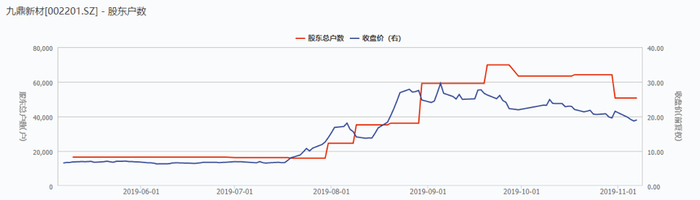 7月18日至9月5日期间,九鼎新材股价在36个交易日里,从7.35元一路飙升至32.55元的近期最高价,区间涨幅超过300%。9月5日之后,公司股价开始回落,截至11月7日,公司股价收报19.01元。