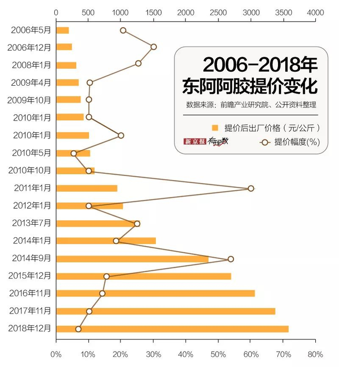 在积极营销的作用下,从2006年开始,阿胶价格平均每8个月提一次价格,噌噌噌,从每公斤80多元涨价到如今的3000多元。面对阿胶的价格上涨,秦玉峰曾表示,涨价是价值回归,其目标价位是6000元/斤。