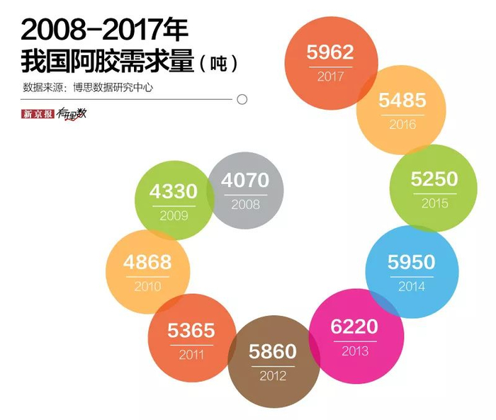 《2018年中国阿胶行业分析报告》显示, 2017年我国市场对阿胶的需求量已经高达5962吨,实际驴皮的需求是480万张,按照这个标准,中国的驴存栏量远不能达到市场的供需平衡。