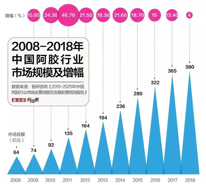 从2008年的64亿元到2018年380亿元,10年之间阿胶的市场规模扩大了5倍不止。但提价是一把双刃剑,频繁的提价会让消费者产生抵触心理,一部分消费者选择放弃购买阿胶产品。2011年阿胶的提价幅度最高,但其市场规模增长速度出现下降。