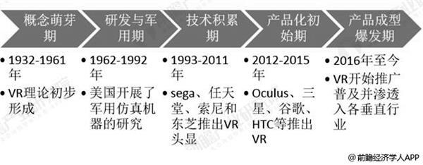 VR起源于上世纪,最早用于军用仿真器的研发,于本世纪初拓展到民用的游戏场景,此后又延伸到视频、社交和教学等领域。2016年是VR元年,市场上VR产品“百花齐放”,VR概念开始推广普及并渗透入各垂直行业。