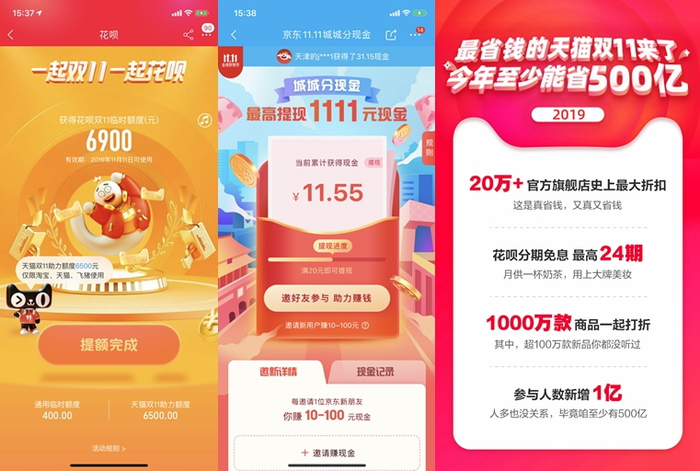 蚂蚁花呗推出了临时提额,用户进入活动页面点击提额即可领取临时额度,从几百到上千不等,仅可在“双11”当天使用。就中新经纬记者体验而言,一次点击提升400元左右,在连续点击后,最终领取到6500元的临时额度;京东金融也联合线上线下众多合作伙伴发放10亿元消费“京贴”。