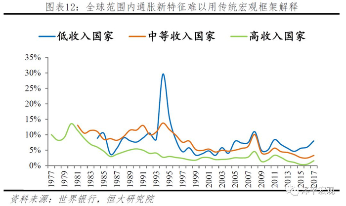 自上世纪90年代以来,全球范围内通胀整体呈现回落趋势,且波动率有所下降。根据世界银行的统计,高收入国家整体的CPI增速由1977年的10.1%波动下降至2018年的1.9%,近10年来的波幅在4%左右。中等收入国家整体的CPI由1981年的13.1%波动下降至2018年的3.6%,近10年来的波幅在7.5%左右。低收入国家整体的CPI由1984年的8.8%上下波动至2017年的8%,近10年的波幅在6%左右。