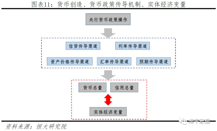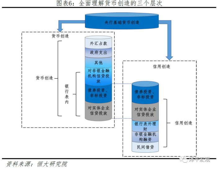 第一层是央行的基础货币创造,是货币及信用创造的源头,央行通过货币政策工具调节基础货币,实现对于广义货币创造的调控,主要制约因素取决于央行货币政策操作的最终目标。