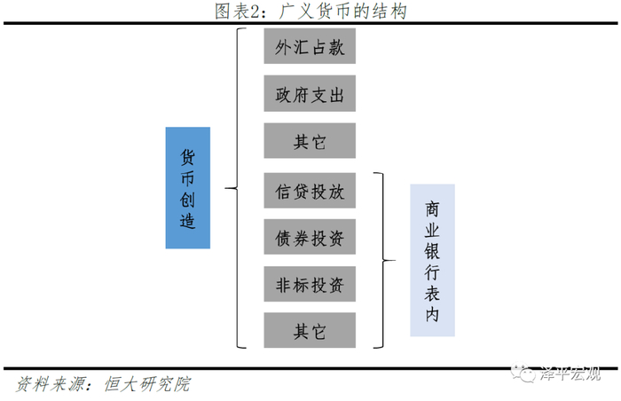 第二层是商业银行的广义货币创造。在信用货币制度下,广义货币的创造主要取决于商业银行,商业银行通过各类贷款、证券净投资等方式派生货币,每进行一笔融资,即“凭空”创造出一笔货币。商业银行的货币创造有以下制约因素:一是外部监管,主要指流动性和资本的监管约束;二是内部约束,主要指信贷需求和盈利要求。此外,外汇占款、政府支出及其他项目,也构成广义货币的组成部分。