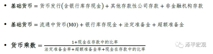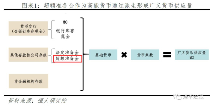 央行创造基础货币,并通过调节基础货币,来调控商业银行创造广义货币的能力。现实中真正的高能货币是超额准备金,央行数量型货币政策的落脚点在于调控银行的超额准备金,影响银行的贷款能力。基础货币通过货币乘数与货币供给产生联系,即基础货币*货币乘数=广义货币供应量(M2)。