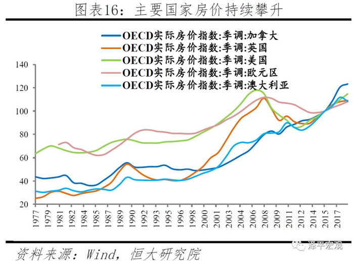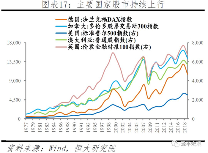70年代以来,全球资产价格持续增长。房价方面,主要经济体均呈现持续上升态势,在1977-2018年间,加拿大房价增幅为185.11%、英国房价增幅为334.96%、美国房价增幅为80.46%、欧元区房价增幅为51.85%、澳大利亚房价增幅为248.76%。股市方面,主要经济体股市均呈现波动上升态势,在1977-2018年间,美国股指涨幅高达25倍,德国股指涨幅约为18倍,加拿大股指涨幅约为13倍,澳大利亚股指涨幅约为10倍,英国股指涨幅约为5倍。