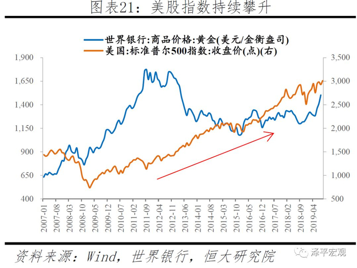 金融危机后,美国的资产价格上涨以股价和初级商品价格的上涨表现出来。次贷危机后,美国政府针对房地产市场加强金融监管、控制杠杆,房地产市场逐渐复苏,过度投机风险不明显,市场整体较为健康,2018年自住住房和租赁住房的空置率分别约1.5%和7%,均回落至80-90年代的平均水平。在房地产市场基本平稳的背景下,美股迎来10年的长牛走势,在2009年2月到2018年12月间上涨了241%,此外商品价格也出现了一定上涨,黄金价格在2007年6月到2012年10月间上涨了166%。