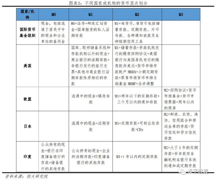 货币派生结束后,基于流动性的不同,我们可以对货币进行分层,不同层次的货币具有不同的流动性。一般来说,西方经济学家根据货币的变现能力将货币分为以下4个层次:M0=现金;M1=现金+活期存款;M2=M1+储蓄存款+活期存款;M3=M2+非银行金融机构的存款;M4=M3+金融机构外的短期金融工具。但各国有不同的划分标准,且随着历史演进,交易媒介和支付手段的日渐繁多,使各国货币当局不断地拓展货币总量的边界。总体来看,M1强调货币的交易媒介功能,M2则更注重货币的价值贮藏功能。